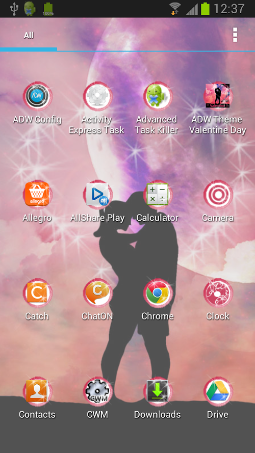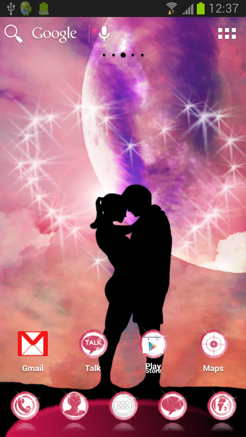 Wallpaper shows couple in love with big moon and pink clouds in the background. Heart and shining stars are flying above lovers. Background of main menu application is also couple in love on pink background. Each of icons contains white and pink wheel in the background. More important icons have been changed to white and pink. This theme is perfect to Valentine's Day.