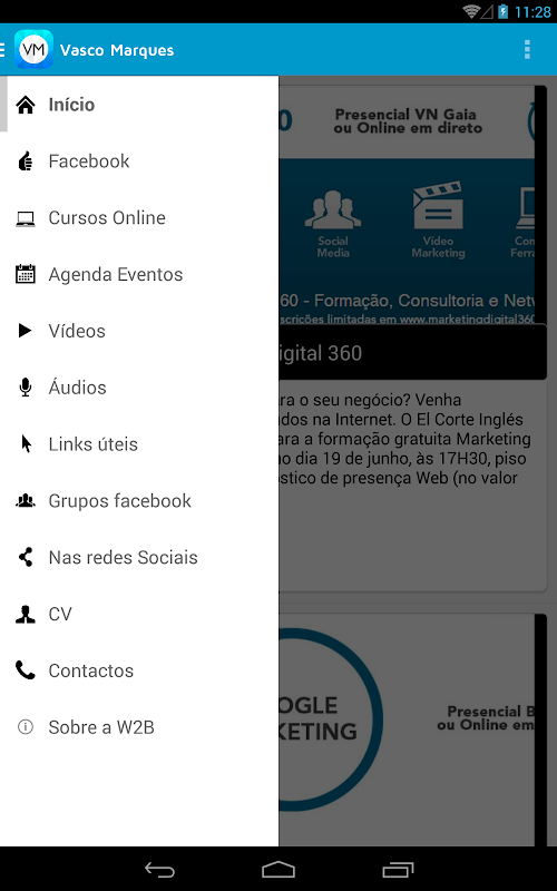 Aceda facilmente a inúmeros recursos relacionados com Marketing Digital. Diariamente é partilhado conhecimento em vários formatos. Acompanhe também os nossos eventos presenciais, online e transmissões em direto. Disponível centenas de vídeos, áudios e apresentações. Para além dos links úteis, pode também acompanhar-nos em diversos grupos. Se desejar estão disponíveis cursos online de Marketing Digital. Mais informações em www.vascomarques.com e www.web2business.pt e www.marketingdigital360.netEasily access numerous resources related to Digital Marketing. Daily knowledge is shared in various formats. Also follow our live events, online and live broadcasts. Available hundreds of videos, audios and presentations. In addition to useful links can also follow us in different groups. If you want online courses in Digital Marketing are available. More information on www.vascomarques.com and www.web2business.pt and www.marketingdigital360.net