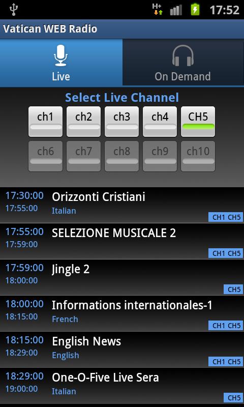 In the "Live" tab, you can listen to the live broadcast on ten different channels and view the schedule in real time.