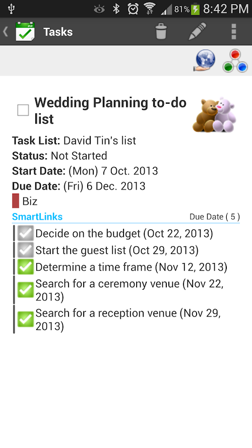 Apart from the standard Google task fields (due date, title, and note), you can set reminder, assign categories, icon, start date, set recurring tasks, priority etc.
