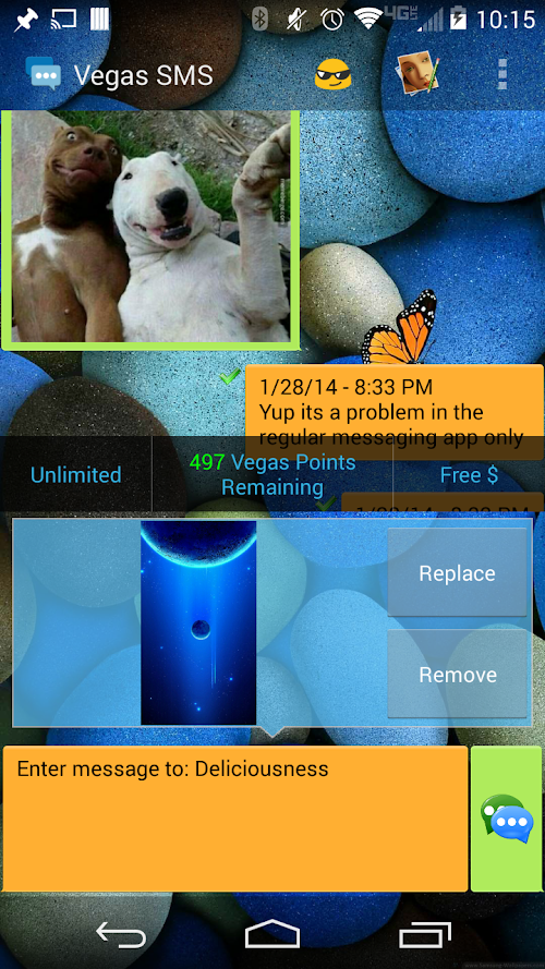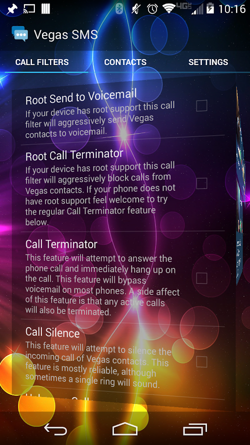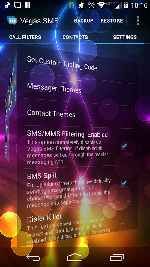 Welcome to Vegas SMS, where what happens in Vegas stays in Vegas. Vegas SMS is the evolution the famous Shady SMS for 4.4+ Kitkat phones and you can switch over seamlessly using the convenient backup and restore system in both applications.