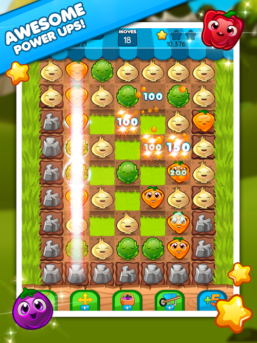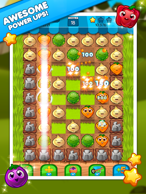 - Boost your score with potent power-ups like the Bomb, Basket and Wheelbarrow. Earn three stars on every level!