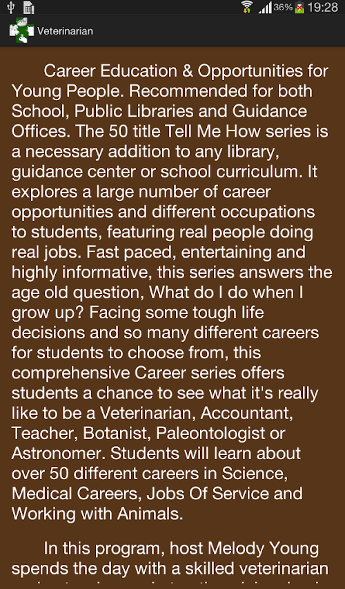 In this app, host Melody Young spends the day with a skilled veterinarian and gets a lesson in treating sick animals. She discovers the extensive training required to be a veterinarian and the rewards of the profession. Subjects Covered Include: Careers related to a veterinarian. What is the difference between a large animal & small animal vet? How long do you have to go to school to be a vet? Why is math important to be a vet? What courses should you take in high school to be a vet? Can you still work with animals if you don't become a vet? Can wild animals become pets? What is a domesticated animal? Do people and animals get the same diseases? Do vets read a lot? What types of pets did the Egyptians have? Are computers important to vets?