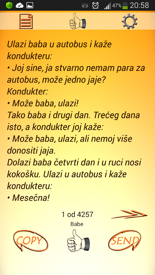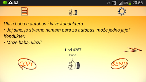 Ugodno čitanje!You can select a category of jokes, send SMS, copy, add jokes on Facebook.