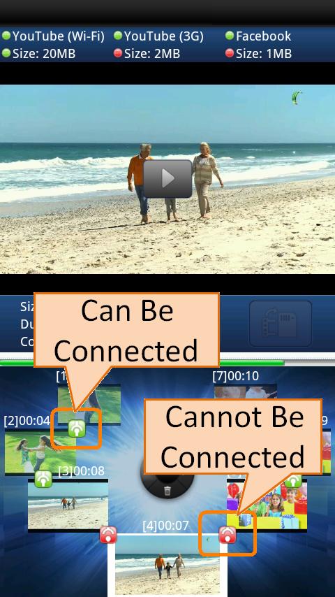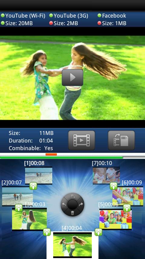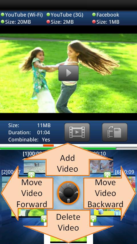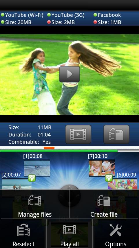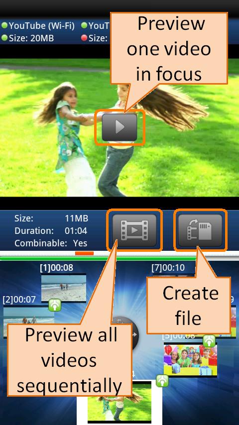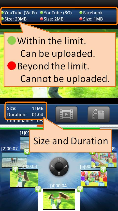 Note: This app is designed to import and combine 3gp and mp4 files shot and recorded using smartphones, but not the video files taken from internet sites. Please also note that the files with different compression format nor different resolution cannot be combined.
