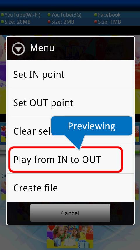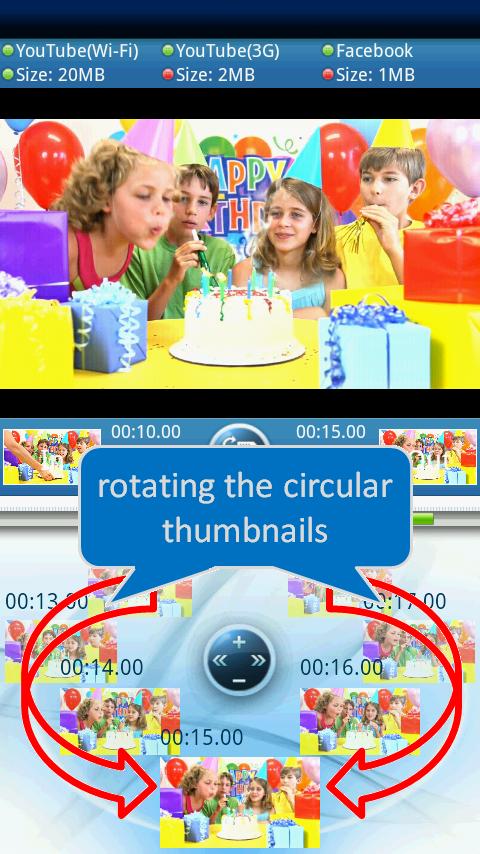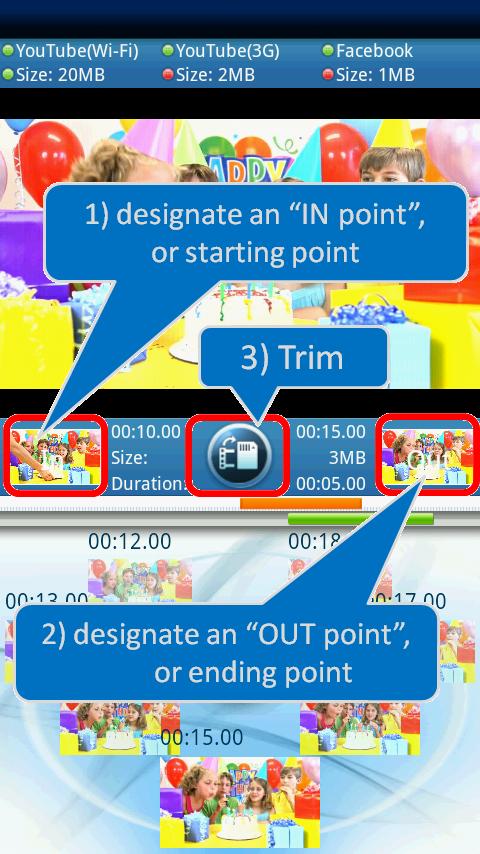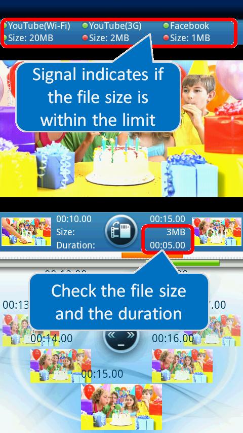 You can check the estimated duration and file size at the center of the screen before you actually trim the video. You also can check the signals at the top to see if the file size is within the limit to upload to popular the sites like YouTube.