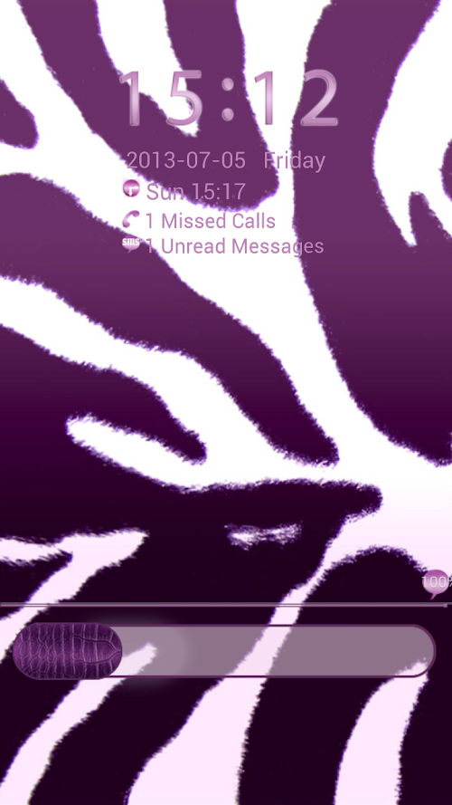 Lock your phone with zebra fur theme. Lock bar is in transparent violet color, the slider on the lock looks like violet pattern of snake skin. Date and clock are in shades of violet. If you like nature and animals, especially these wild from savanna please see our other application with zebra fur theme. In our other projects you can also find animals from zoo and themes with leopard pattern.