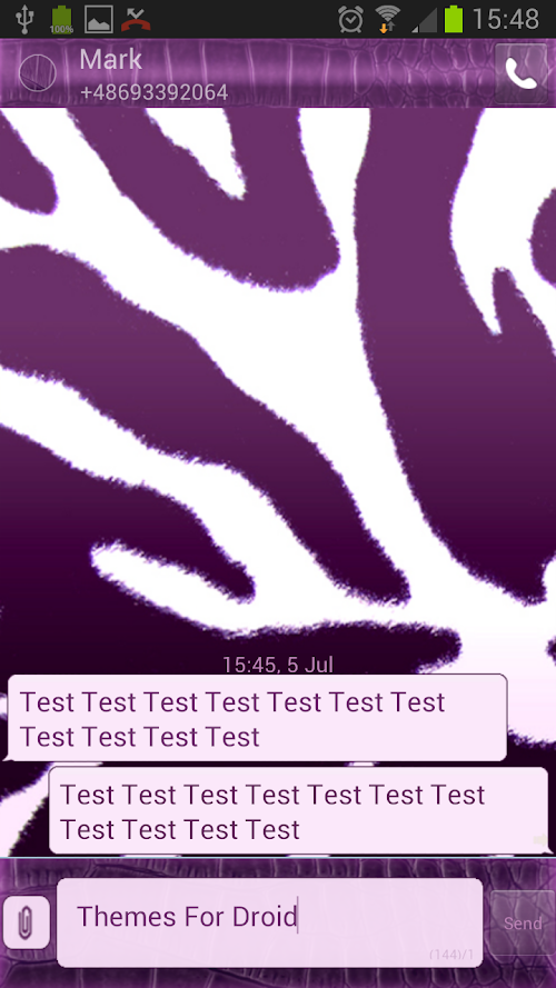Zebra fur theme. Names of contacts and sms in the preview are in white color. Each of contacts has icon which looks like purple wheel with pattern of snake skin. Menu of selected sms is also violet pattern of zebra fur, text of sms is violet on the light violet background. Screen of sms is in light purple color. Text of sms and name of contact are in dark violet color. Other elements are in shades of violet. If you like this theme please see our other application with pattern of zebra fur or other animals for example leopard.