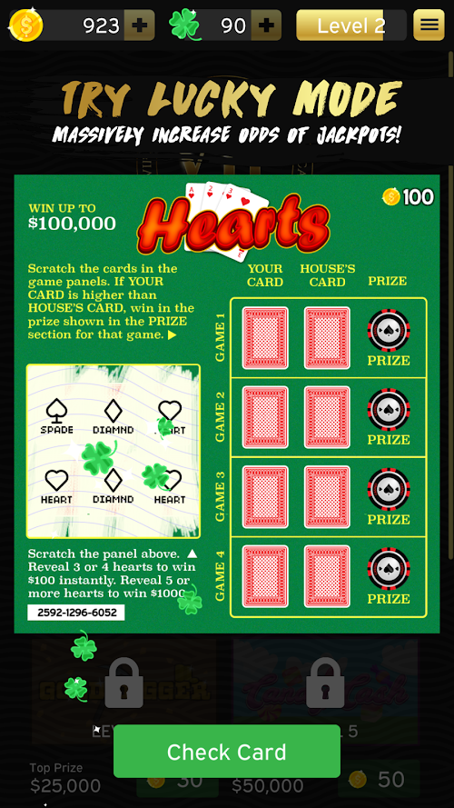 Level up and unlock new scratch cards progressively as you play. Scratch off bonus panels to win bonus money.