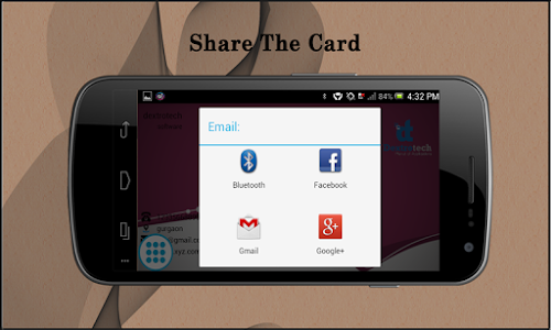 VISITING CARD ORGANIZER lets you create Business card which you can use as business contact cards as well as social networking cards to share with your clients, business partners or other mates. Business Card Organizer helps you out by creating attractive and custom visiting cards, set what ever profile details you want, set your image or company logo, choosing from variety of available visiting card themes and easily share with so many popular ways like Gmail, Whatsapp, WiFi, Bluetooth, Facebook, Google+ and so many easy ways.
