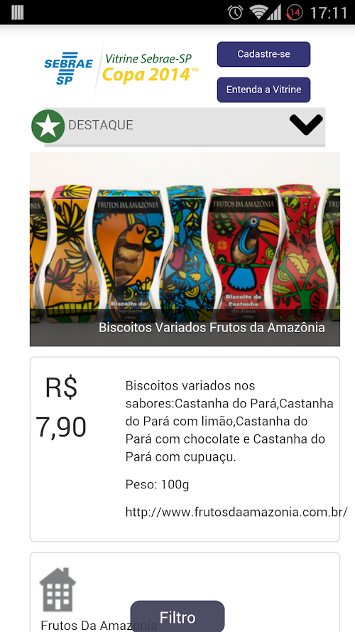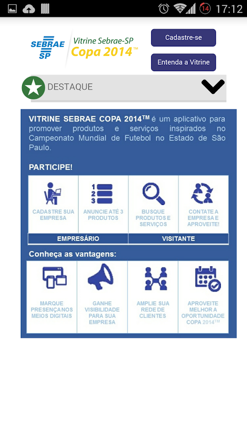 Na Vitrine Sebrae-SP Copa 2014 você poderá incluir a foto e a descrição de até 3 produtos ou serviços, que poderão ser acessados em todo o Brasil - por meio de internet, celulares e tablets -, por potenciais clientes de sua empresa. São milhares de brasileiros e estrangeiros que viverão intensamente o clima deste mega evento!Prizes Sebrae-SP 2014 World Cup you can include a photo and description of up to 3 products or services that can be accessed throughout Brazil - through internet, mobile phones and tablets - by potential customers of your business. Thousands of Brazilians and foreigners who live intensely the climate of this mega event!