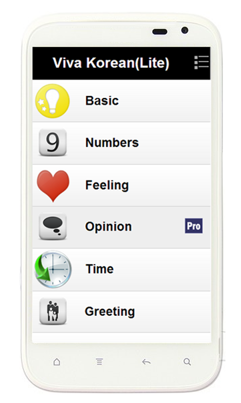 Pro Version Category(20): Basic, Numbers, Feeling, Opinion, Time, Greeting, Weather, Transportation, Communication, Shopping, Hotel, Restaurant, Hobby, Learning, Culture, Emergency, Internet, Hospital, Pharmacy, Bank