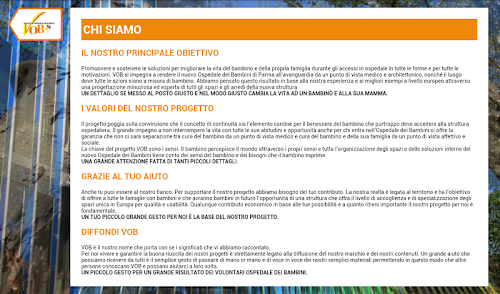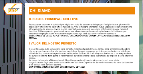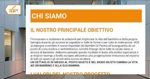 The APP allows all the moms and dads to know the operation and design guidelines that have allowed us to realize the new pediatrics in Parma, a unique structure that puts the child at the center. News, information, and above all how to see the NOB New Children's Hospital allows all families to be virtually guided tour to the knowledge of the NOB. VOB Volunteers Children's Hospital is responsible for disseminating the values and the operation of the Hospital to assist patients who come from all over Italy and some specialties from all over the world.