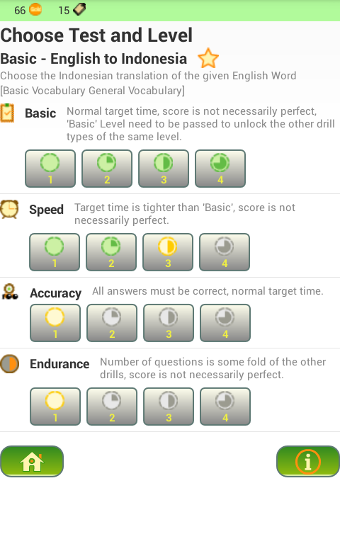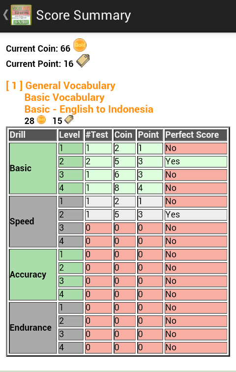 8. Score summary, which summarize total number of test, coins, points acquired for each lesson-drill-level. User can see which lessons/drills/levels need more attention.
