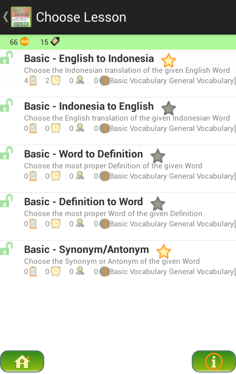 To make it more fun, this app comes with Coin and Point. You need coin to unlock subject and lesson. Once you unlock it, you can play unlimited. Mean while, Point is accumulation of your achievement to be compared with others in Leaderboard.