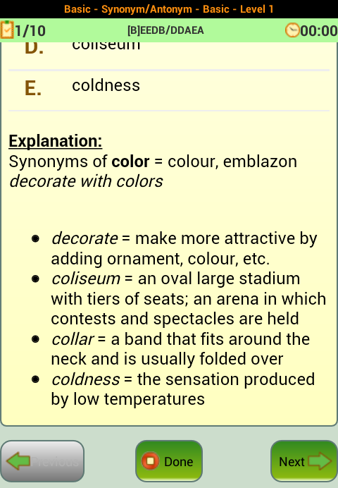 7. Test answer key and explanation is provided at the end of each test, so user can review the answers, while learning from failure