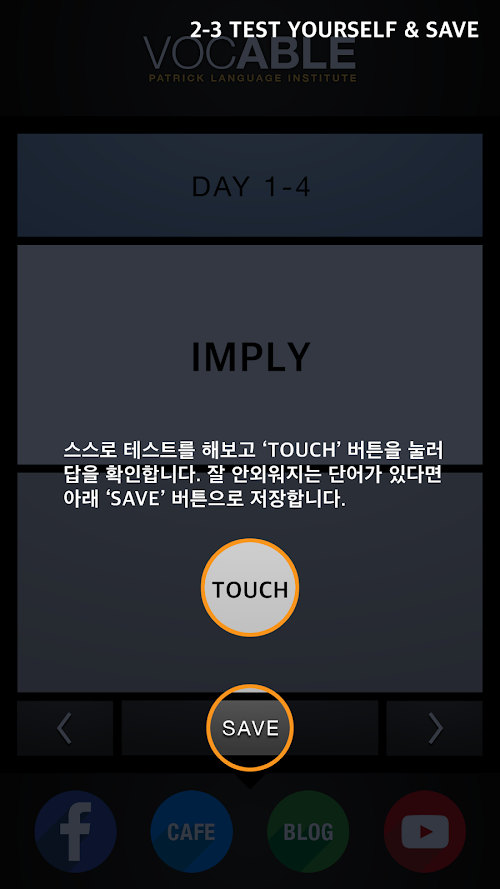 - 본인이 외운 것과 다를경우 또는 외우지 못했을 경우 SAVE 버튼을 눌러 MyVocab 으로 저장하세요.