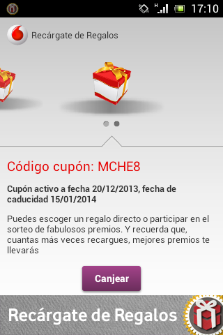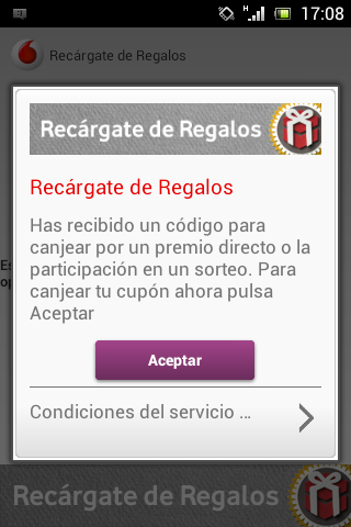 Consulta más y períodos promocionales www.recargatederegalos.com. Aplican las normas de uso razonable, consúltalas en www.vodafone.es Application for Vodafone prepaid customers to easily redeem code "Recharge Gift" for gifts.