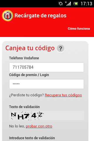 Aplicación para clientes prepago de Vodafone para canjear fácilmente los códigos de "Recárgate de Regalos" por regalos.
