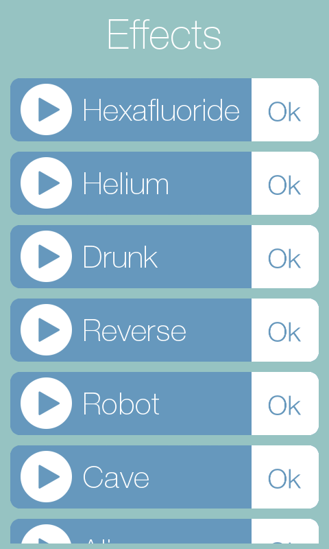 Thanks to voice changer you can apply many effects to your voice (robot, smurf, drunk...). If you want to make jokes your friends or have a funny time, try this application. Via this application you can record your voice or any sound easily apply funny effects to it.