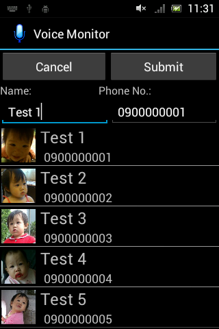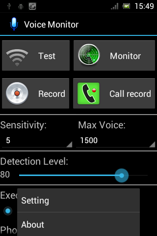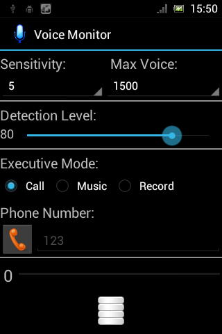 Voice Monitor is an app that helps you in watching your baby when you are not around. It uses the built-in microphone to detect noise. If it detects noise, it alerts you by a call or play a music or record. Easy record widget(please install APP to your phone. It can't be use if you install to SD card)