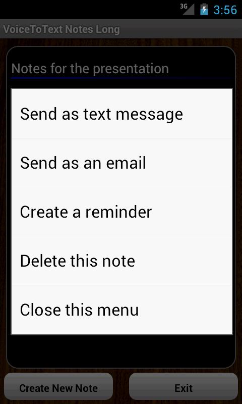 This is a app that lets you create long notes. You can create each note by recording your voice (the app will convert your spoken message to text automatically) or you can type in the note using your phone's keyboard. Each recording can last up to 40 seconds. This is ideal for dictation, recording long messages or stories.