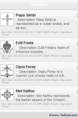 Empower yourself with Haitian Voodoo Talismans / Veve Symbols right at the palm of your hand, with percise description, a Voodoo Glossary and a list of the worlds most powerful Voodoo Spells users can now make their dreams come true. Meditate on the symbols included here and invoke the ancient spirits / Lao / Angels to do your Will, gain luck in love, money, work, friendships and more, the possibilities are infinit.