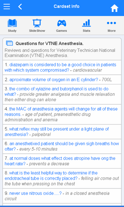 Using Flashcard will help you learn faster and remember more in a shorter time by showing flashcards just before you will forget them. VTNE Flashcards app has several learning modes: Study, Slide show, Matching, Memorize, Quiz to make the learning process for VTNE exam more exciting and fun.