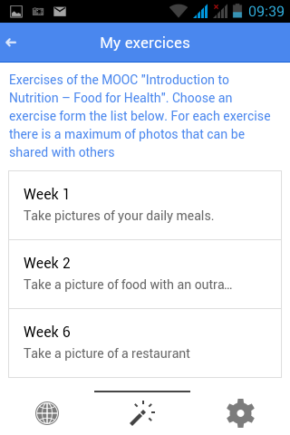 In this MOOC-APP there are a number of exercise that encourage you to upload a photo of a meal or specific foods that you consumed. The photos will be shared with other members of the MOOC