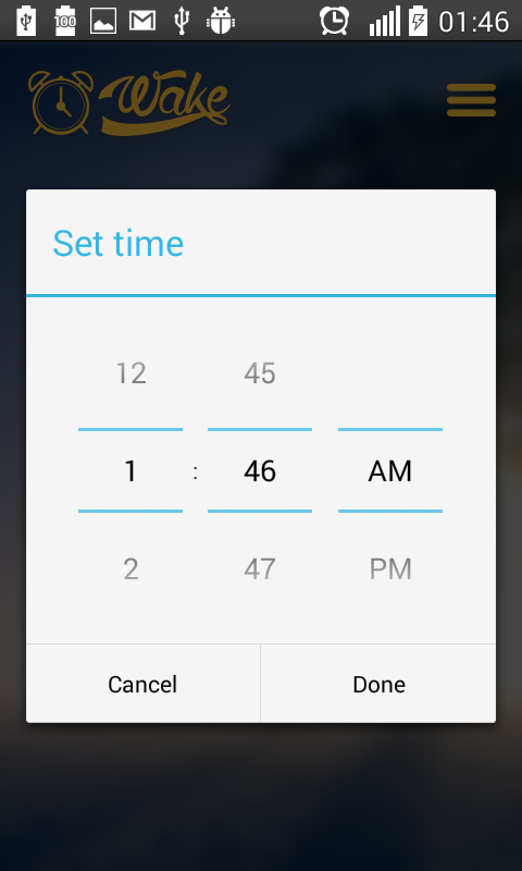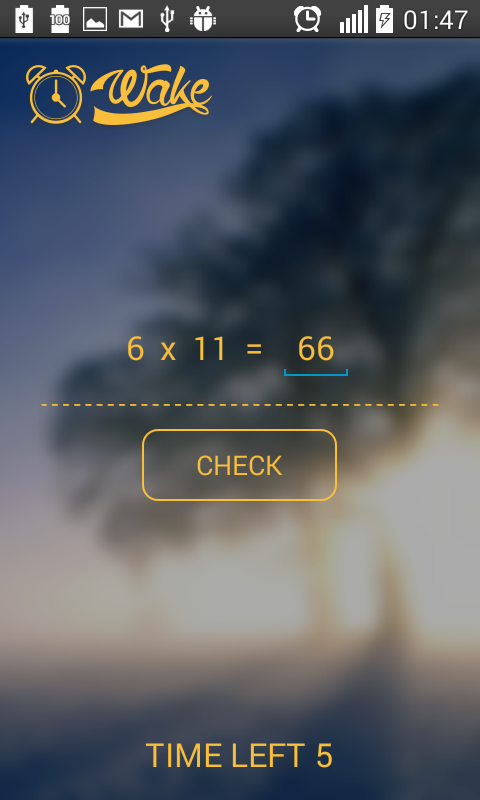 Wake is an alarm clock application that will force you to think to turn it off. It because you have to solve mathematic operation with random number and operator with 20 seconds. If the time running out, the number and operator will randomly change, so think fast!