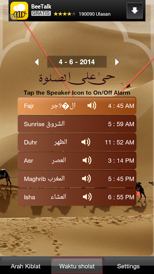 Semoga bisa bermanfaat Prayer time and Qibla is the Android application for Muslims around the world. Applications alarm will sound every prayer time arrives. application is also equipped with a compass direction of the qibla that are customized to the user's position through GPS network.