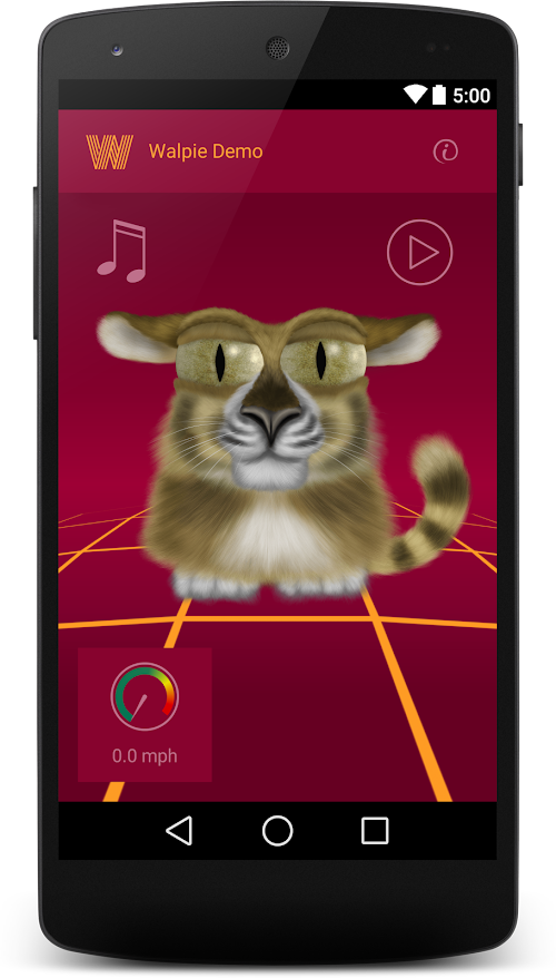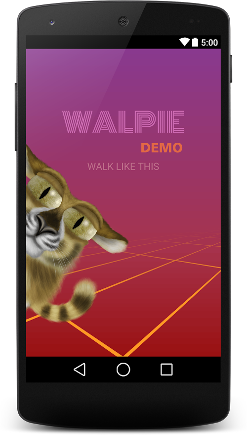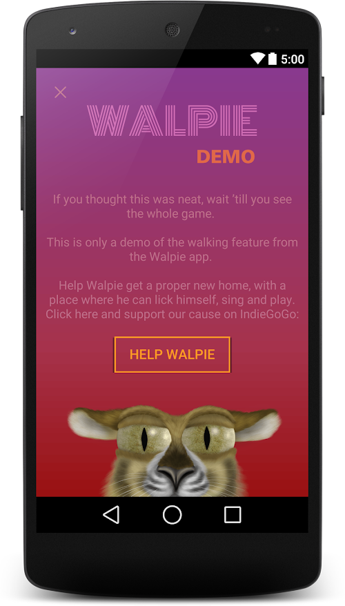 This is a demo version of the upcoming Walpie app that has limited features. In this demo version, you can take a walk with Walpie, but no score will be kept. You can walk in the rhythm of Walpie's favorite song called Feline Dancer by switching on the music. Avoid moving too fast (like running, or riding a bicycle), otherwise Walpie will fall out of your phone, and you won't be able to recover him.