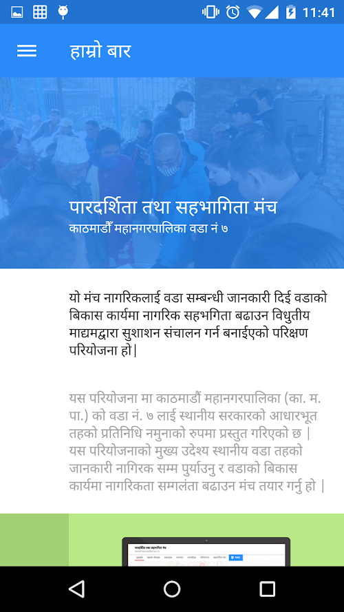 Ward 7 Engagement platform app lets you view development projects happening at Ward 7 of Kathmandu Metropolitan city. You may also provide feedback to improve the projects or simply provide status of the projects.