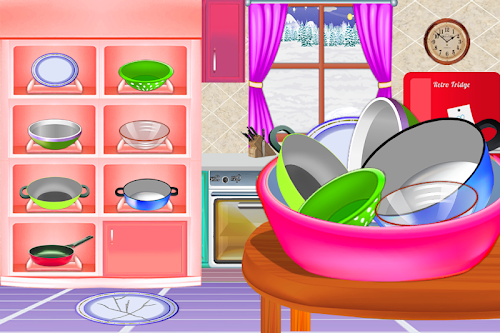 After you have gathered you will have to wash the dishes. Add detergent. Carefully wash each plate. Now you have to clean all vessels with a towel. Now you have to sit all the vessels in the closet. While washing the dishes you have broken one so now please stick it.