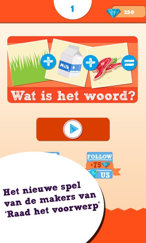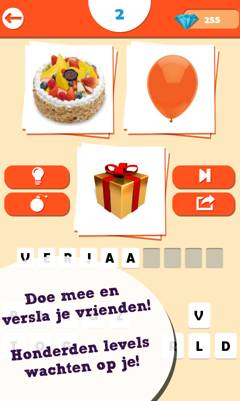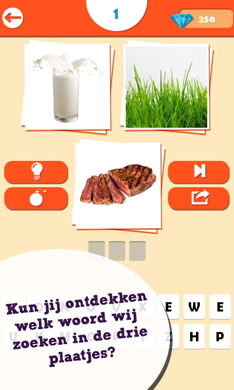 Kun jij uit drie plaatjes het woord raden wat wij zoeken? Het begint vrij makkelijk, maar al snel zul je merken dat het best pittig wordt. Kom je er echt niet uit, vraag het dan aan je vrienden via social media, of gebruik een hint! Speel je door honderden levels heen, en haal de finish! We zullen net als in onze andere apps regelmatig met updates komen om nieuwe levels toe te voegen.