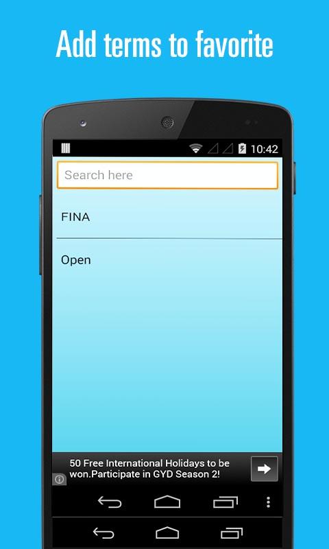 The application will be the best guide and online dictionary for the beginners and the water polo lovers with lot of in-built features to quickly search the newly added terms and organize their favorite terms with easy navigation. All the terms are arranged alphabetically with the meaningful and easily understandable description.