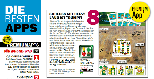 The application is easy to use. It serves both the experienced "Swatter" for entertainment, as well as a beginner who wants the Watten like to learn. It is selectable between 2 and 4-player mode. To this end, the rules are also once more in the application for future reference available. Tapping an opponent, switching between "Betti" and "Alfonso".