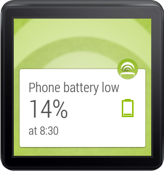 - New notification card on wearable: phone battery low! Get a notification on your Android Wear stream when you handheld device battery is low.