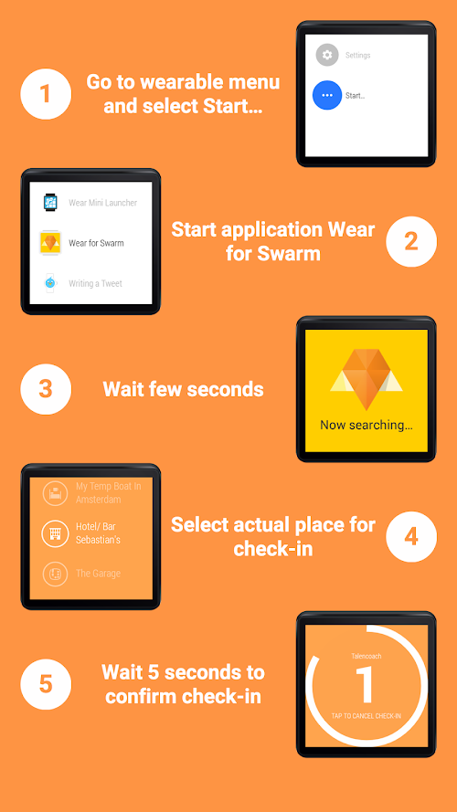 With Wear for Swarm you can search for nearby Foursquare places and make a check-in directly from your Android Wear device.