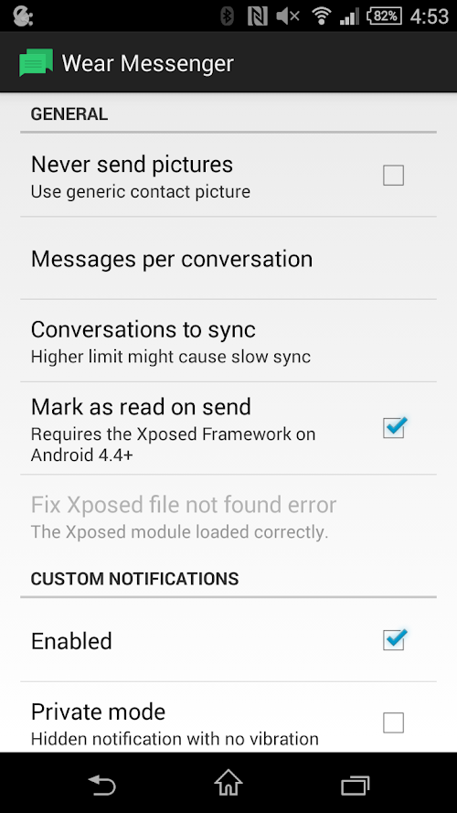 Last but not least, you can link your client's notifications with Wear Messenger's, so whenever you swipe them away on your watch or your phone, they get dismissed on the other part too. Remember to blacklist your SMS client into the Android Wear management app, or you will get double notifications. (Works best on 4.4+, might not be compatible with all clients)