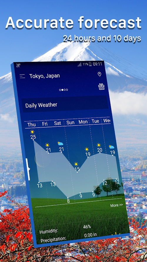 - 1 day, 10 days future forecast and hourly weather forecast.