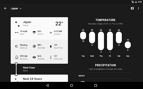 Weather Timeline is a simple weather app that focuses on summarising the next hour, the next 48 hours and the next week so you don't have to. It presents the forecast in a timeline to help you quickly glance and digest the information and has a strong focus on color to outline the weather conditions. The app includes current weather alerts/warnings for your chosen locations.