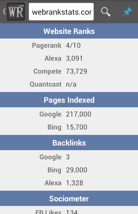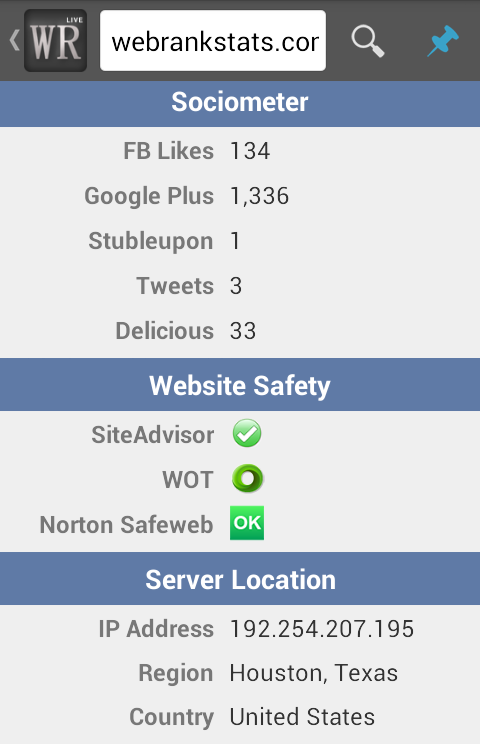 WebRank SEO Live gives you live statistics like website ranks (Google Pagerank, Alexa Rank, Compete Rank and Quantcast Rank), social statistics, website security, server location, pages indexed and backlinks as per Google and Bing. It fetches data in real time to give you the most up-to-date stats. No more waiting for your web stats to be updated. Its completely customizable, you decide what stats you want to see. Saving on time, data and making it more productive.