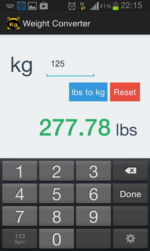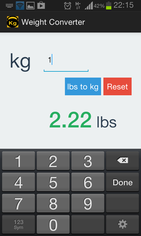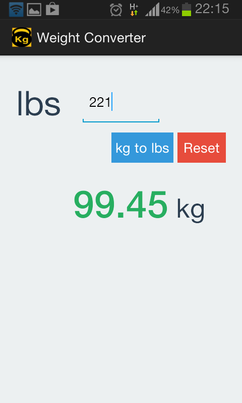 Weight Converter is a simply app which convert weight units, lbs to kg and kg to lbs. It is easy to use just type value in the field.
