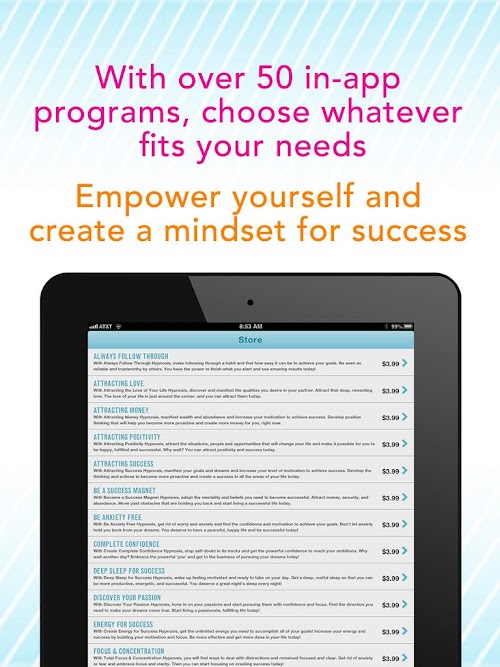 * Your choice of one of eight different soothing background animations and sounds to enhance your hypnosis experience
