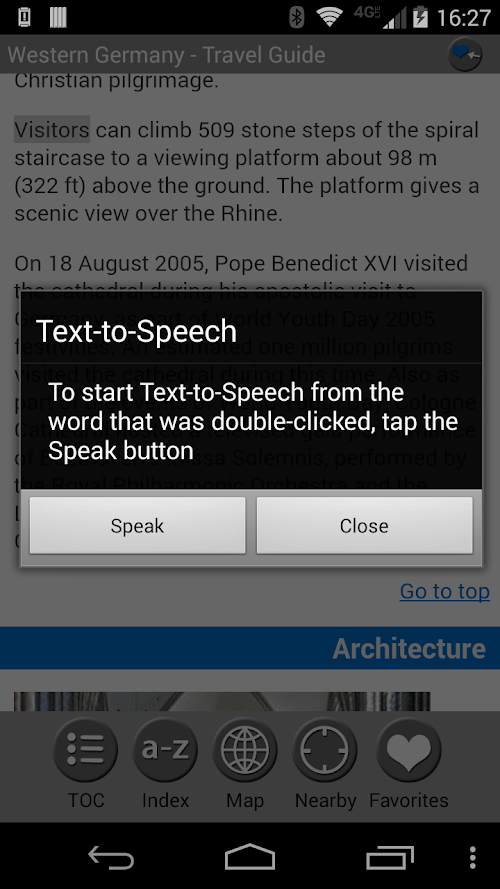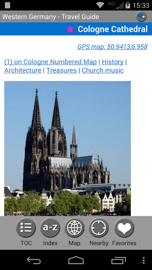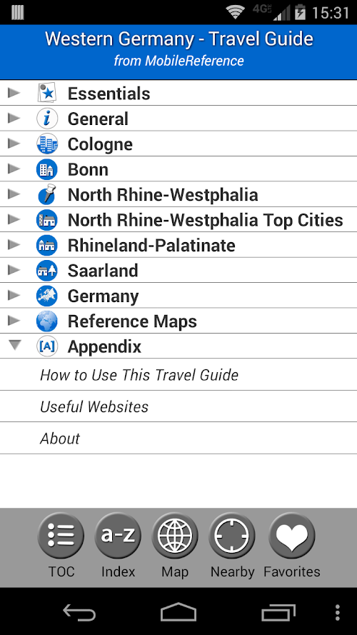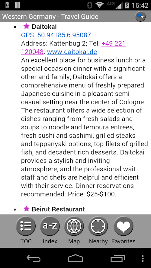 MobileReference Travel Guides provide detailed, practical information about attractions, landmarks, transportation, cultural venues, dining, lodging, history and much more. They are indexed alphabetically and by category, making it easier to access individual articles. Attractions can be viewed on an offline GPS map along with your current location so that you can easily find attractions near you as you explore the city.