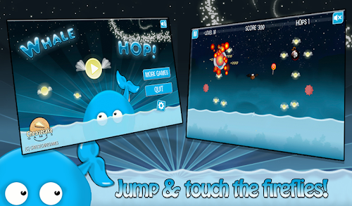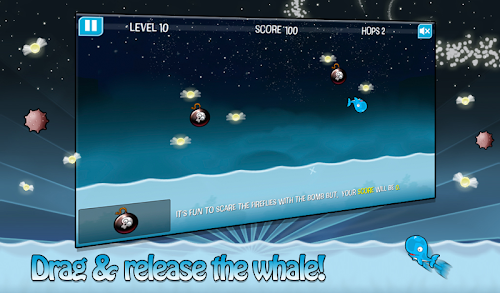 Whelen the whale loves to play with fireflies. Drag and release her and jump to scare all the fireflies.