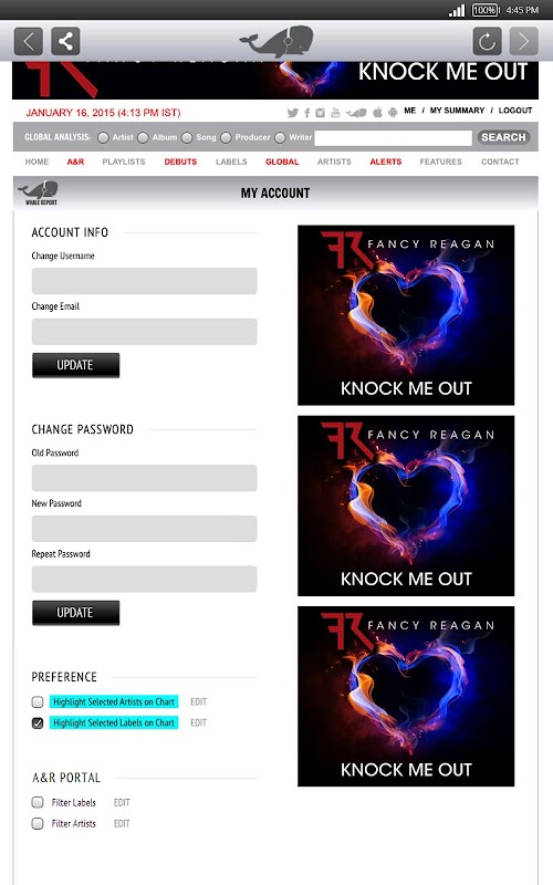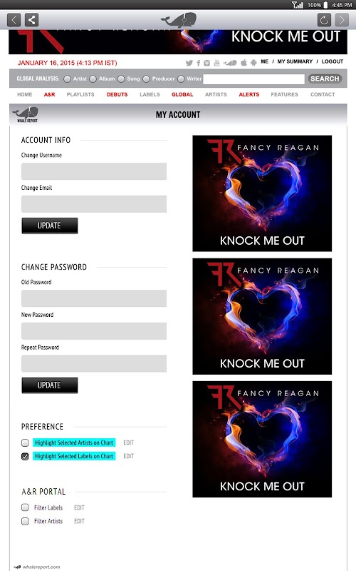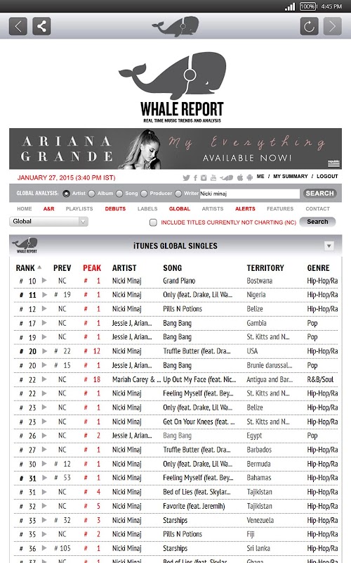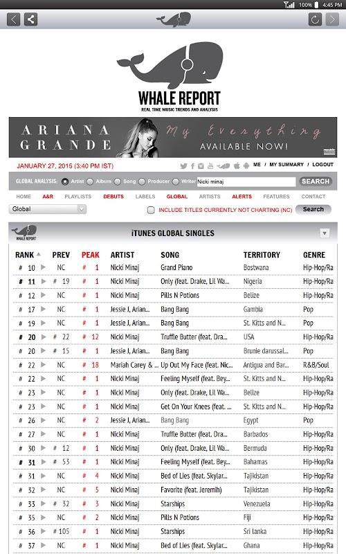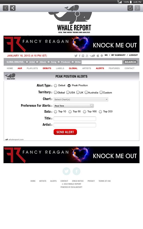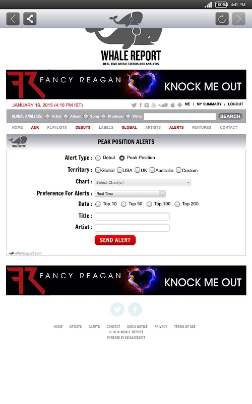 Catering to music industry professionals, the Whale Report enhances user experience by providing audio to every song listed in the top charts. Other exclusive features to the Whale Report include Global Chart searches, artist pages, and top debuts, which recognize new titles appearing on the single or album charts in real time. The Whale Report provides unprecedented convenience to users by allowing these features to be retrieved in custom reports and daily alerts.