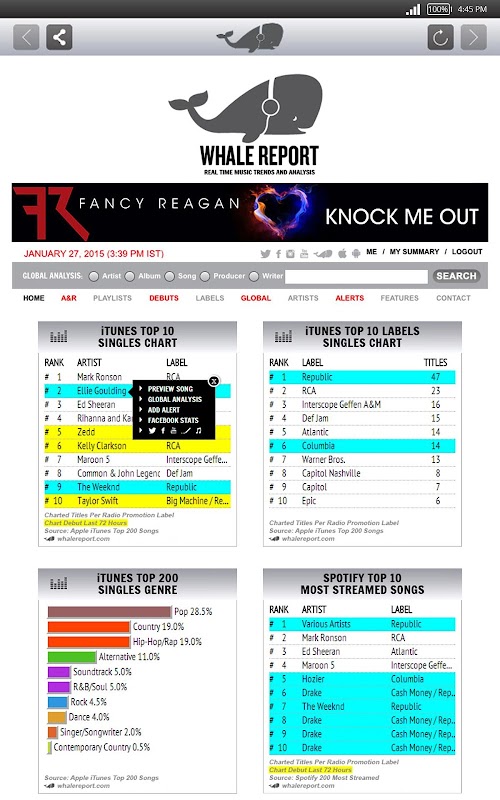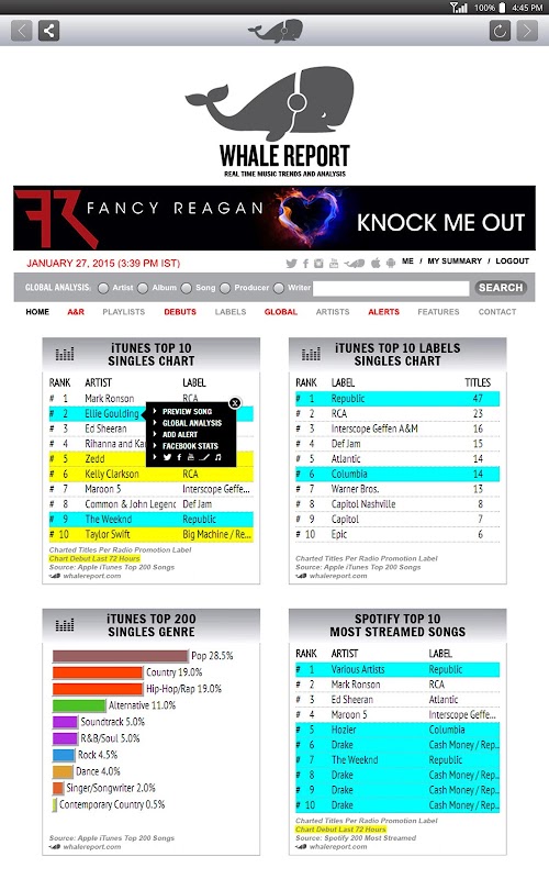 The Whale Report is an executive dashboard created exclusively for music business professionals. This industry overview provides instant data and analysis for music executives, utilizing the most popular and reliable industry websites. Based on real time data, the Whale Report allows users to search and analyze a large variety of music charts and data.