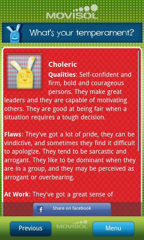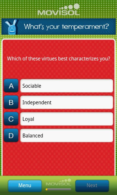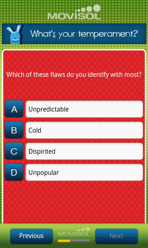 This version of What is your temperament? Android App comes with one universal variant which will work on all the Android devices.
